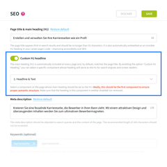 Sie können für jede Seite Ihrer Karriereseite eine eigene Hauptüberschrift definieren. Das verbessert die Auffindbarkeit in Suchmaschinen und erleichtert Screenreadern die Orientierung. Wird keine Überschrift gesetzt, erstellt das System automatisch eine passende H1 für eine klare Seitenstruktur.